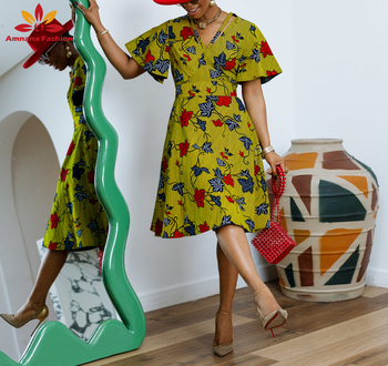 שמלת midi הדפסה אפריקאית עם שרוולים קצרים מודגש קצר-קו חצאית אנקרה שמלה